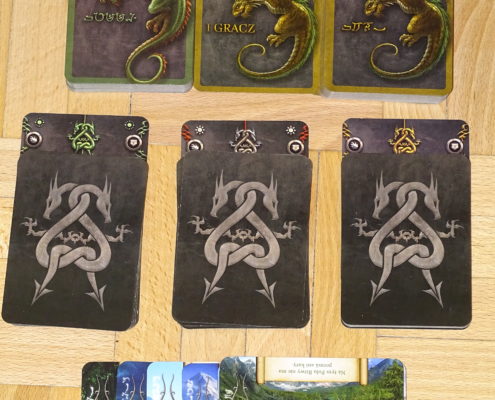 Walki smoczych magów mają niestety swoje wady. Zacznę od tego, co przed chwilą określiłem, jako zaletę. Nie wszystkim spodoba się konieczność znajomości wszystkich kart i elementów, do skutecznej gry. Bez tego się po prostu nie da dobrze grać i mniej cierpliwi mogą się od tego tytułu odbić po pierwszych porażkach. Kolejna sprawa to losowość. Losowo wybierane pola bitew, losowo dociągane smoki, walka dystansowa na podstawie losowo wystawianych kart, walka w zwarciu za pomocą losowo dobranej talii walki. Sporo. Owszem da się to kontrolować, osoba uważna potrafi przekuć to na swoją korzyść, ale gracze uczuleni na dużą dawkę losowości powinni sobie ten tytuł odpuścić. Ostatnia sprawa to czas gry. Zamulacz zniszczy rozgrywkę w Draco Magi. Decyzje, wpływające na całą partię, podejmujemy tu z każdą rzuconą kartą i jeśli ktoś bardzo długo się zastanawia, to cała gra przeciągnie się w nieskończoność. Ja ani razu nie zszedłem do obiecywanych na pudełku trzydziestu minut na rozgrywkę, średnio gra zajmowała nam około czterdziestu pięciu minut.