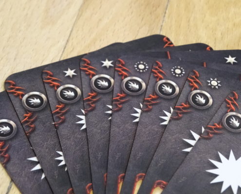 Gdy obaj gracze spasują przechodzimy do fazy walki w zwarciu. Pierwszy gracz decyduje, o które pole bitwy będzie toczyła się pierwsza walka. Dobieramy liczbę kart walki, zgodną z sumą wartości walki smoków w zwarciu i naprzemiennie gracze wykonują ataki. Na kartach na samej górze możemy znaleźć księżyc, gwiazdę, lub słońce. Jeśli gracz chce rzucić kilka kart naraz może to zrobić, ale tylko zagrywając karty z tymi samymi symbolami, na przykład same słońca. Na dole karty mamy opis ataku. Jeśli atakujemy szponami, to przeciwnik musi zagrać kartę szponów, żeby nie stracić smoka. Analogicznie wygląda to przy kłach, czy magii. Są specjalne karty, każda z nich jest dobrze opisana i nie powinniście mieć wątpliwości, do czego służy. Zasada podstawowa w walce jest taka: każdy nieobroniony atak zabija jednego smoka. Bardzo ważną kartą jest karta lotu. Pozwala ona nam obronić się przed dowolną ilością ataków przeciwnika bez znaczenia na ich typy. Chyba, że przeciwnik zagra kartę niepozwalającą nam uciec lotem…
