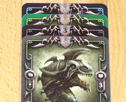 Każdy smok poza ilustracją, nazwą i cechą specjalną, posiada trzy liczby. Na górze mamy liczbę kart walki dociąganą w fazie walki w zwarciu, po lewej liczbę kart do ataku dystansowego, po prawo do obrony przed tymże. W momencie wykonywania ataku dystansowego, gracz atakujący dobiera liczbę kart walki nie większą niż liczba po lewej stronie karty smoka. Na każdej karcie walki znajdziemy pięć rzeczy. W tym momencie interesują nas tylko białe gwiazdki po lewej i prawej stronie karty. Po lewo, oznaczoną symbolem ataku, mamy siłę karty przy ataku dystansowym, a po prawo przy obronie, wartość defensywy. Jeśli atakujący uzyska więcej symboli ataku, niż przeciwnik obrony, to górny smok (ten ostatnio wystawiony) przeciwnika ginie.