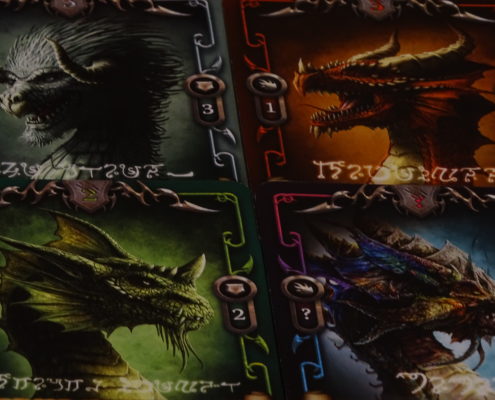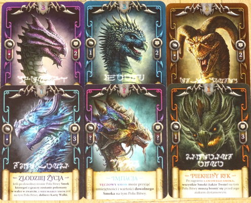 Ilość typów smoków jest również wartością dodaną. Czarne smoki, posiadające umiejętność kałuży kwasu, „rozpuszczające” jedną kartę walki przeciwnika. Fioletowe smoki ukrywające się przed wrogiem. Polarne smoki zamrażające pole bitwy. Potężne bitewne smoki, najsilniejsze i najodporniejsze w grze, których sam wygląd uzasadnia statystyki. Konieczność odpowiedniego wykorzystania posiadanych smoków na danych polach – przecież nikt by nie wysłał mechanicznego smoka na pustynię, ani polarnego na pole lawy! Może konkurencja nie jest zbyt liczna, ale jak dla mnie to najbardziej klimatyczna gra o smokach, w jaką miałem przyjemność zagrać.
