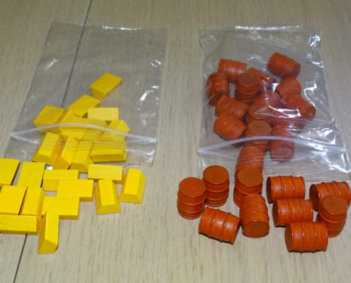 W standardowym kartonowym insercie, znajdziemy także kilka zestawów kart, a także znaczniki złota i piwa, czyli sztabki i beczułki. Zwłaszcza te drugie robią świetne wrażenie i jestem zachwycony faktem, że zastałem je w pudełku. Trochę szkoda, że woreczki strunowe zostały dodane tylko do przechowywania surowców. Jest to niedroga rzecz, a powoli staje się jednak standardem, że bez dodatkowych nakładów możemy bezpiecznie i sensownie przechowywać wszystkie karty i elementy w oddzielnych torebeczkach, zapewnionych przez wydawcę.