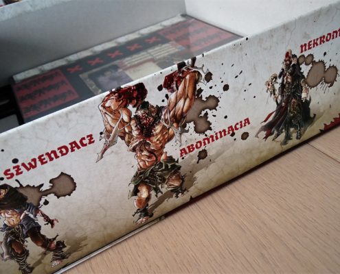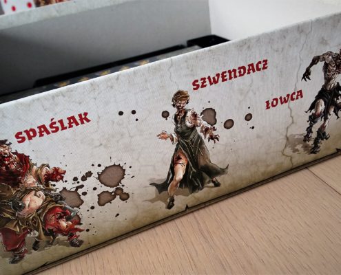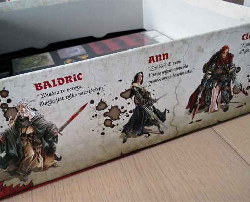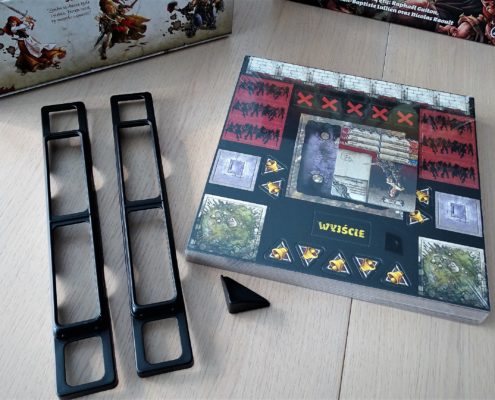 Boki pudełka są utrzymane w klimacie okładki, ale po zdjęciu wieczka byłem… zdziwiony. Spodziewałem się, że zostanę zaatakowany bogactwem wnętrza, a tymczasem widzę instrukcję i… wypraskę? Co to takiego?