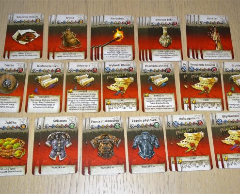 Karty są dobrej jakości, a to co prezentują wyczerpuje temat fantasy w grach planszowych. Czego tu nie ma… Miecze, kule ognia, zbroje, tarcze, łuki, topory, sztylety, jabłka… Kart postaci niestety w wersji sklepowej mamy tylko sześć, ale i tak wydają się być wystarczającymi do przejścia całej kampanii w jednym składzie osobowym.