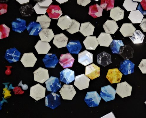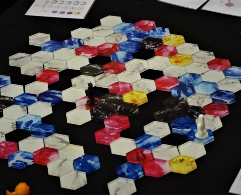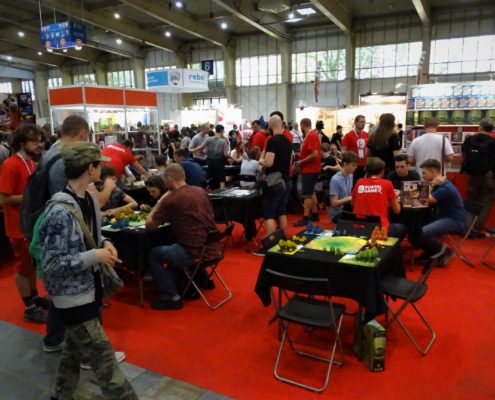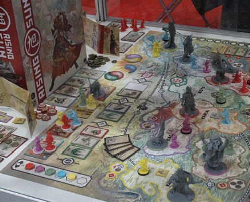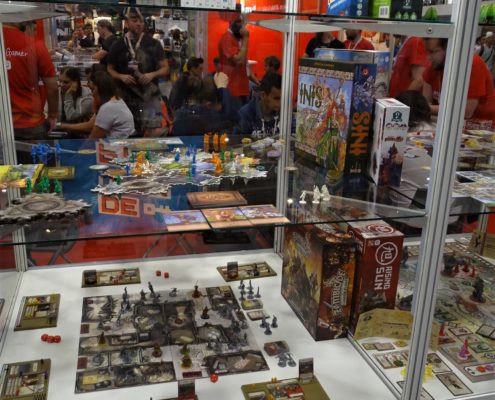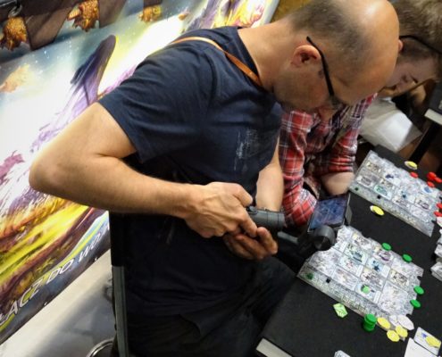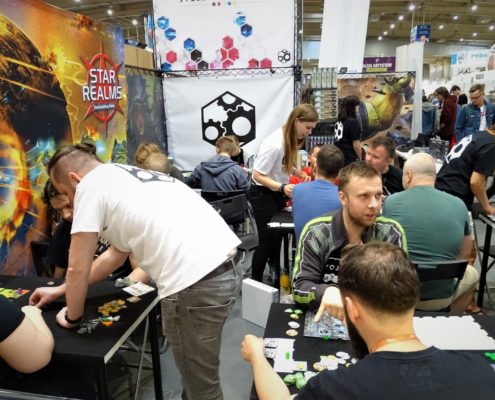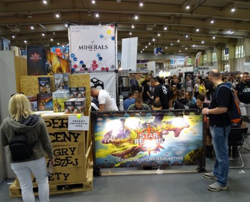 Pierwszym dużym planszówkowym stoiskiem, jakie napotkałem w czasie swojej wędrówki przez halę numer 5 należało do wydawnictwa GFP. Marcin Ropka zapewnił mnie, że wszystkie zapowiedziane przez nich gry prędzej, czy później się ukażą. Wiem, że brzmi to niekonkretnie, ale niestety w takich funkcjonujemy realiach. Pech polega na tym, że aktualne problemy są niezależne od firmy. Dyskusje ze służbą celną krótkie nie są, a właśnie tam utknęła część produktów, którymi mieliśmy się już od jakiegoś czasu cieszyć na naszych stołach. Z nowości miałem okazję ograć Solar City (recenzja prototypu już niedługo na blogu), a także posłuchać o ambitnej pracy magisterskiej w postaci gry planszowej Minerals. Sporą popularnością na stoisku cieszył się Star Realms, ale to prototypy przyciągały uwagę zwiedzających.