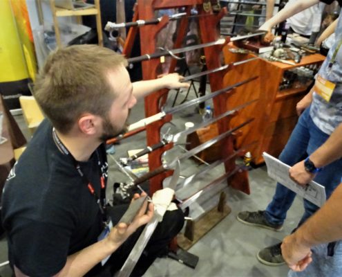 Jako, że Pyrkon od początku był festiwalem przyjaznym Larpom nie mogło zabraknąć na nim Rekwizytorni z ich fenomenalnym sprzętem larpowym i bronią bezpieczną. Adam opowiedział mi o nowinkach, które szykują Forgotten Dreams i Epic Armoury. Nowa edycja mieczy Medieval Sword zapowiada się wyjątkowo dobrze tyle, że będzie droższa od aktualnej, którą posiadam od ośmiu lat. Nowe noże do rzucania Epic Armoury również zapowiadają się bardzo zachęcająco. Dla fanów „normalnego” oręża z Rekwizytornią wystawiało się Kaer Morhen Forge prowadzona przez Flambergowego (i nie tylko) weterana.