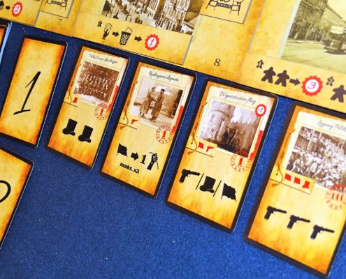 Jak przystało na grę historyczną autorom udało się przemycić w grze sporo klimatu. Oczywiście mechaniki nie mają wiele wspólnego z realiami tamtych dni, ale z drugiej strony akcje dzielą się na dyplomatyczne, wojskowe i społeczne, każda karta jest nazwana po autentycznej organizacji, czy osobie i dla immersji mamy na nich te piękne zdjęcia. Ogólnie w czasie partii jednak stawiamy pionek na „akcji tego miasta co daje pionki” i „kupuję te kartę co ma dwa cylindry” ale i tak jest lepiej niż sądziłem.