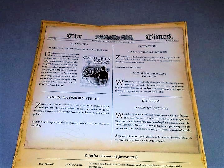 Mechanicznie, jak już wspomniałem, gra jest bardzo prosta. System działa i funkcjonuje. Jedni wolą karty z Detektywa, inni QR Kody z Kronik Zbrodni. Szczerze mówiąc mi Sherlockowe gazety i księgi adresowe bardziej przypominają właśnie ten drugi tytuł, tylko zamiast aplikacji mamy książeczkę paragrafową. Nawet idea informatorów funkcjonuje jak specjaliści z Kronik Zbrodni.