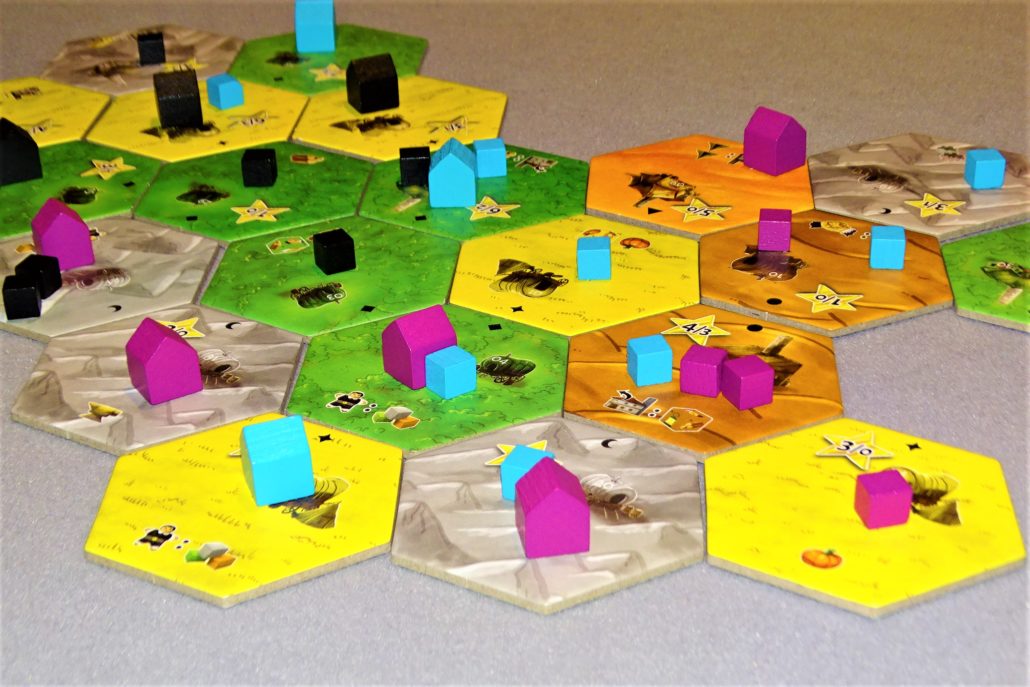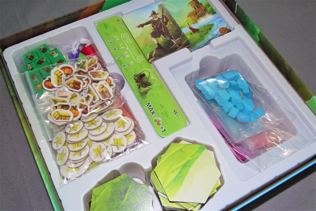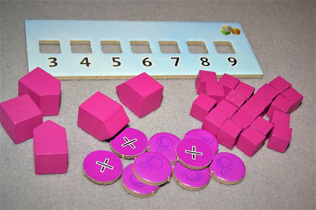 Skoro już jesteśmy przy elementach dla graczy, to każdy z nich otrzyma też swoją planszetkę wskazującą iloma kośćmi będzie rzucał co turę, a także zestaw swoich żetonów i drewnianych elementów. Kolorowe jabłuszka służą do oznaczania technologii, które zdobyliśmy. Kostki i domki będą plenić się po planszy, zapewniając nam przewagę na kaflach terenu, które zapewnią nam różne korzyści materialne.