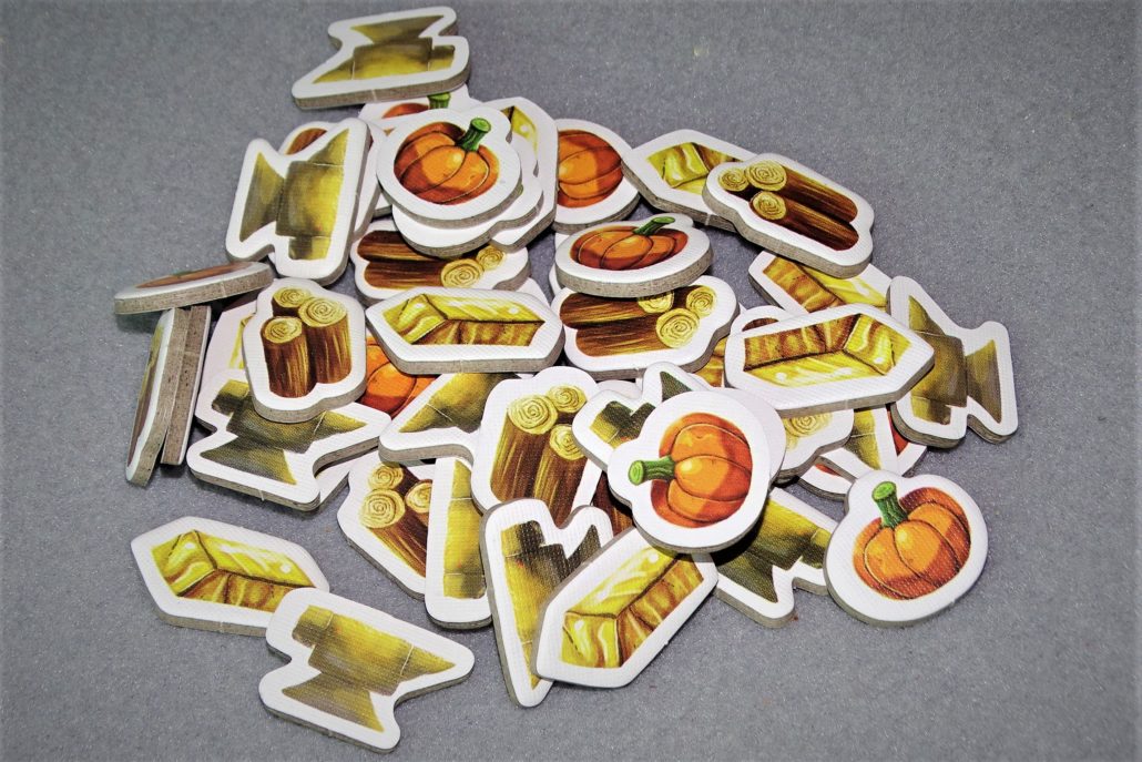 Samych zasobów też trochę się znajdzie. Punkty zwycięstwa, złoto, żelazo, drewno i żywność. Niestety w regularnej sprzedaży mamy tylko zwykłe żetony. W wersji Kickstarterowej mieliśmy dostępną wersję deluxe z figurkami namiotów, domów i surowców.