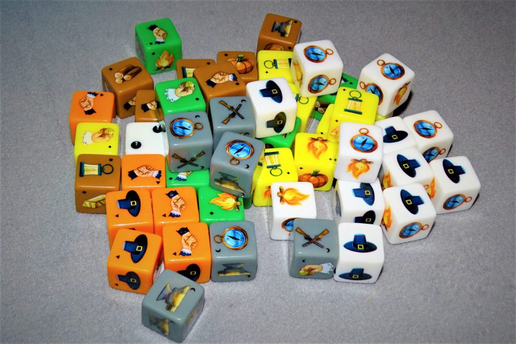 Serduszkiem gry są kości. Nic dziwnego, że mamy ich aż pięćdziesiąt jeden. Podzielono je na sześć rodzajów, które różnią się zarówno kolorem, jak i rysunkami na ściankach. Na każdej planszy gracza jest dokładna rozpiska, jakich wyników możemy oczekiwać, na każdym typie kości. Jest to bardzo istotna dla gry informacja.