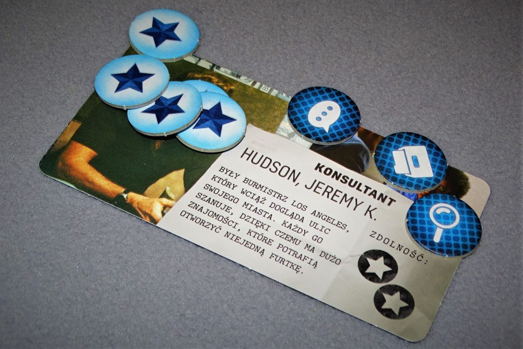 - będziemy mogli przydzielić podejrzanemu obserwację, w zamian za jeden żeton autorytetu, co poskutkuje obszernym raportem, który otrzymamy za kilka godzin roboczych gry