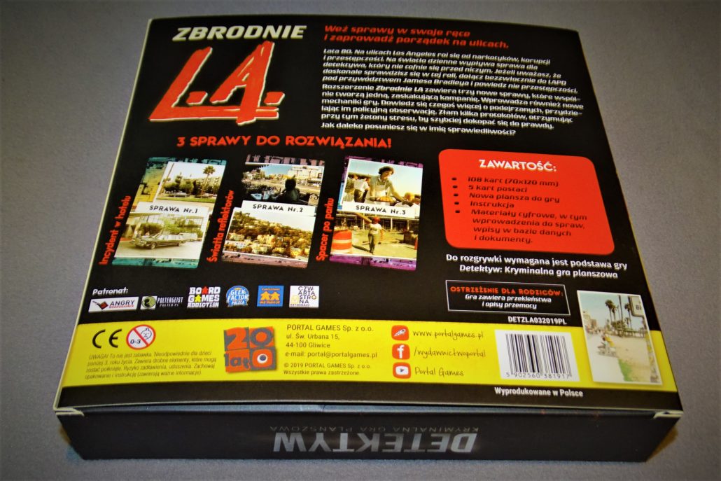 Los Angeles. Miasto aniołów, Hollywood i aktualne miejsce pracy Zlatana Ibrahimovića. Jest to także jeden z symboli amerykańskich filmów akcji lat osiemdziesiątych. Plaga narkotyków, rozpustne życie, szybkie samochody i skorumpowana policja. W takich słonecznych warunkach, przyszło nam zmierzyć się z trzema nowymi scenariuszami do Detektywa Kryminalnej Gry Planszowej. Jak pamiętacie jest to moja ulubiona gra 2018 roku, więc jak łatwo sobie wyobrazić, oczekiwania miałem bardzo wygórowane.