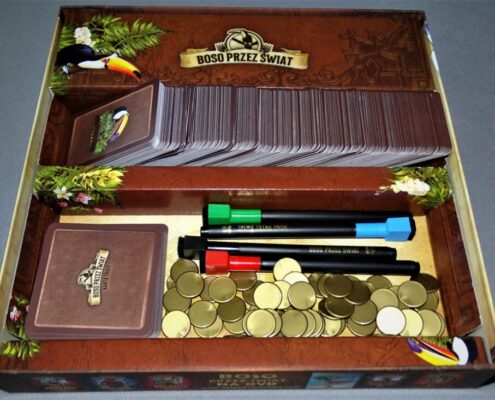 Boso przez Świat to gra typowo familijna. Nie oczekiwaliśmy po niej niesamowicie odkrywczej mechaniki. W dodatku zapowiedzi autorki o braku dogłębnej znajomości rynku gier bez prądu i wspomnienia Wojciecha Cejrowskiego z grania w planszówki w latach osiemdziesiątych nie napawały optymizmem. Miało być prosto i przyjemnie, a może także trochę edukacyjnie. W końcu geografię mniejszych państw znam głównie dzięki obecności rozpoznawalnych klubów piłkarskich, a jak jakiś kraj nie grał w mundialu to dla mnie nie istnieje… Oczywiście trochę przesadzam, ale liczyłem na to, że Boso przez Świat pomoże mi rozbudować moją bazę wiedzy w tym aspekcie. O dziwo zrobiło dużo więcej – dobrze się przy tym bawiłem.